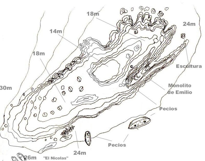 - Desarrollo: bajo se extiende un bajo hacia el sur, alcanzando 37 metros sobre fondo de arena.