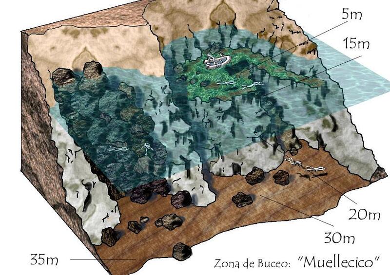 El Muellecico recibe su nombre por la forma del saliente rocoso que recuerda a un pequeño muelle. Posiblemente una de las mejores inmersiones que puedes encontrar en esta guía de buceo.